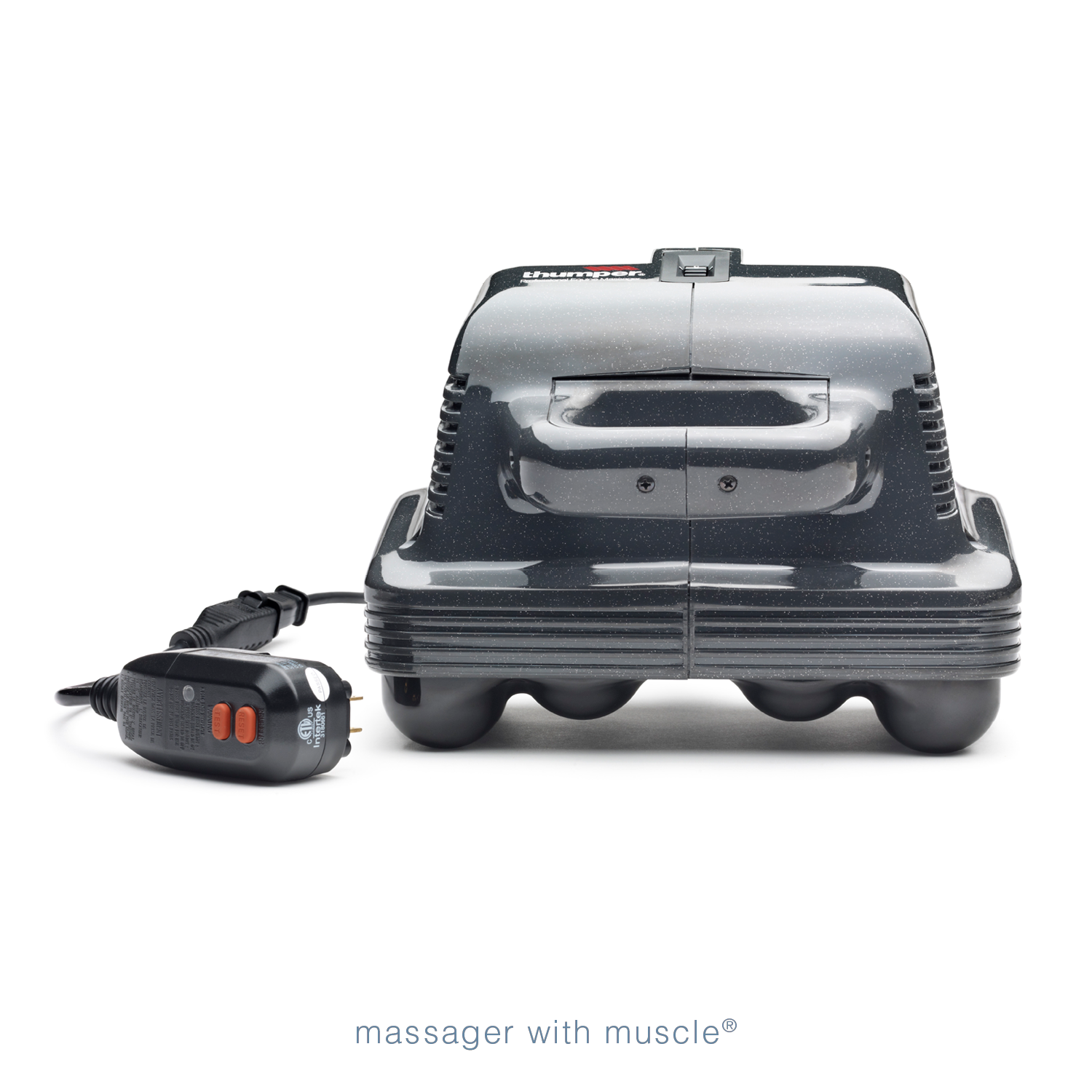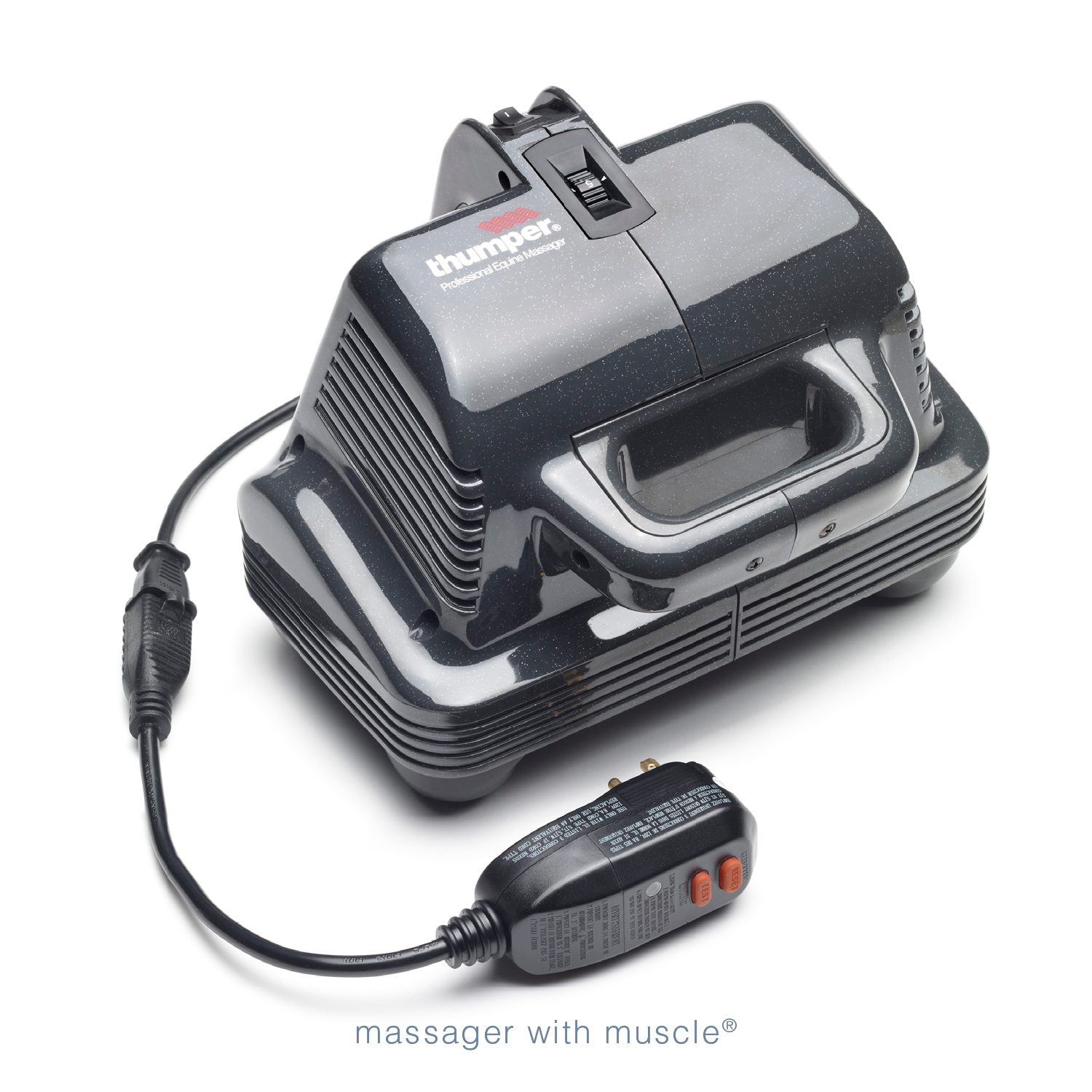 A gray Thumper Equine Pro electric massager designed for horses, showing the device with its power cord and a remote GFCI device.