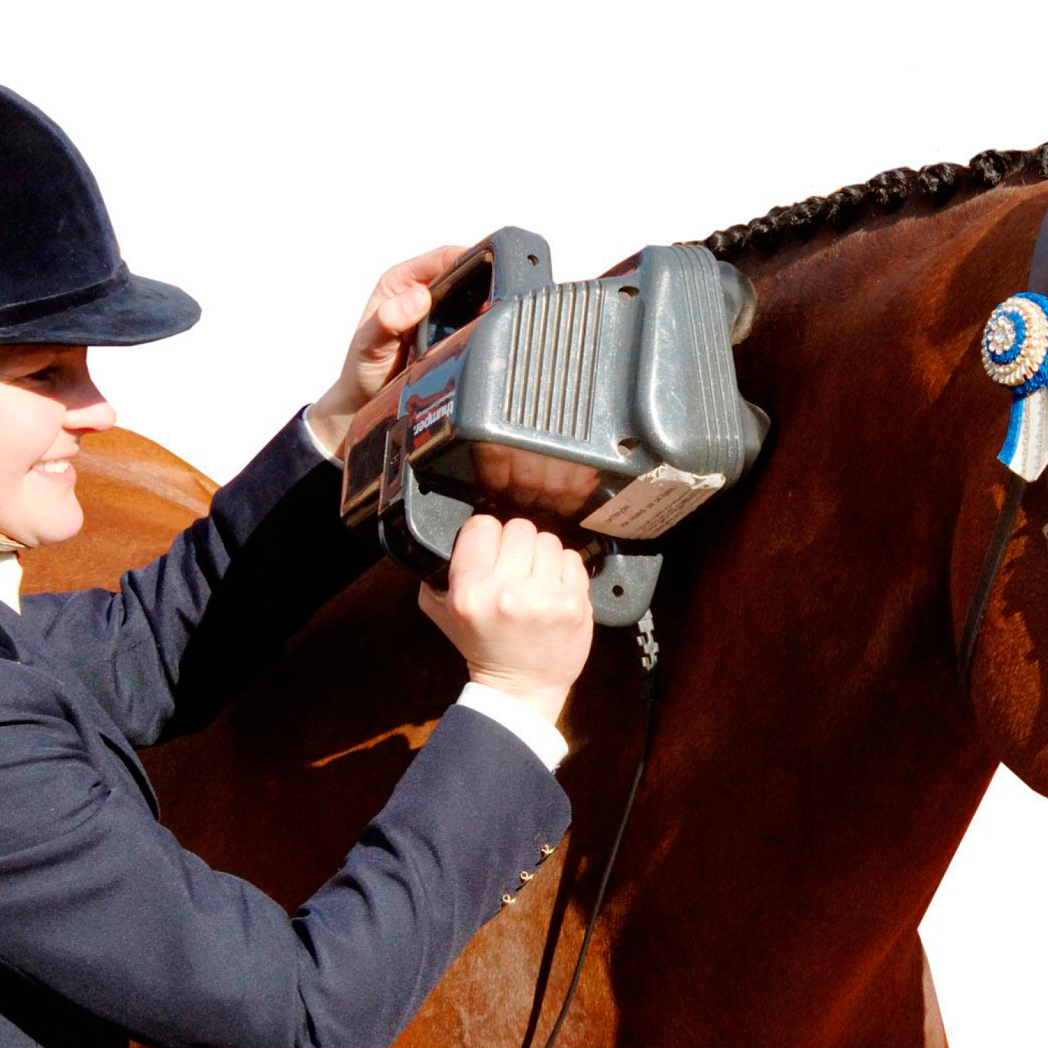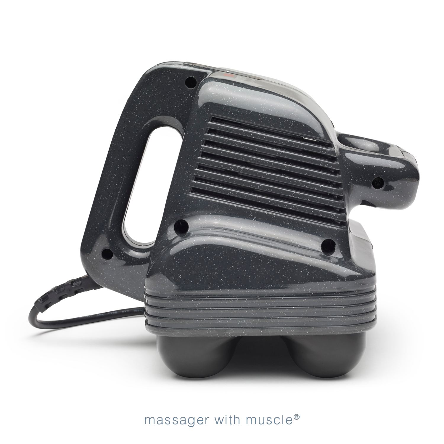 Side profile of Thumper Equine Pro professional horse massager with long balanced handle